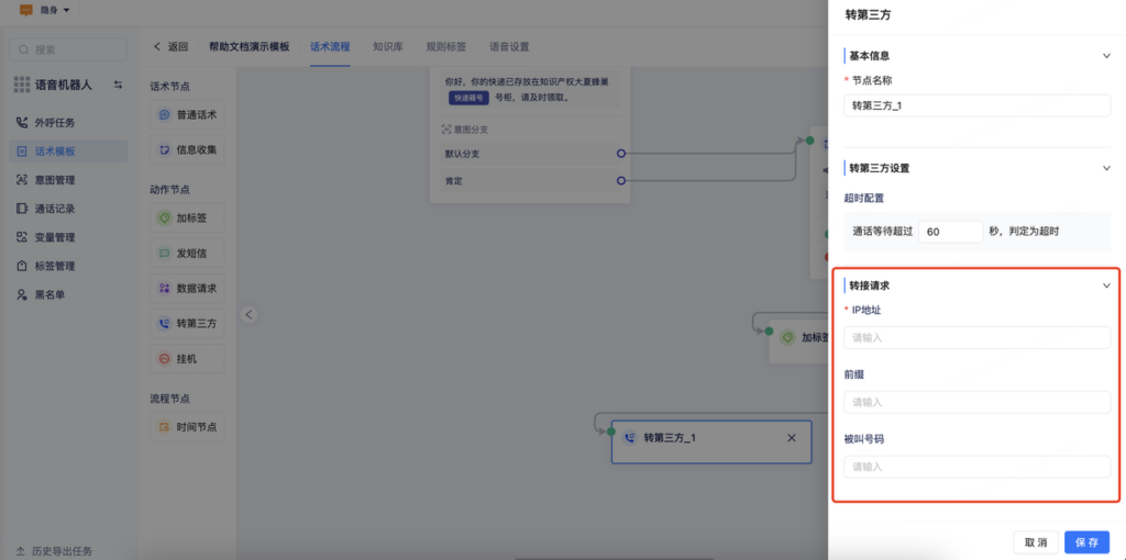 - 数据请求:该节点用于与外部系统进行数据交互,可将通话过程中获取的变量作为参数查询业务系统数据,并将返回结果存储在指定变量字段供后续流程使用