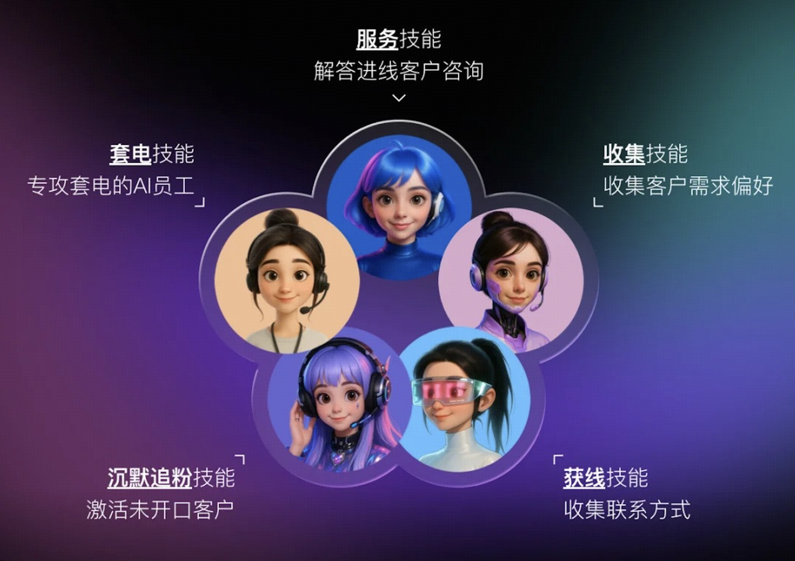 - 获客期: 凭借大模型获客机器人和AI员工7x24h自主接待,实现多渠道流量的秒回和高效留资。