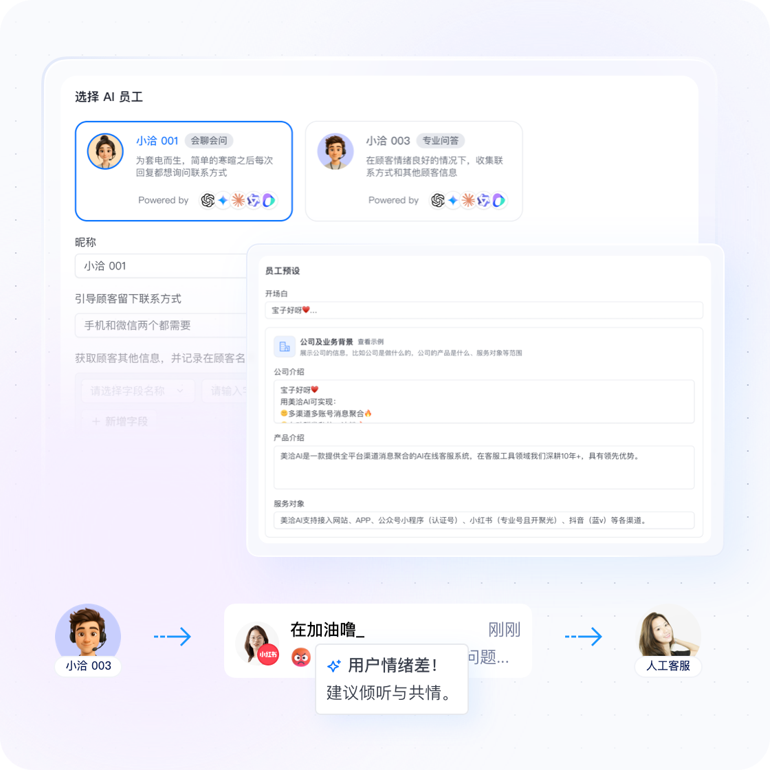 - 实时情绪分析与智能总结: 系统对对话进行实时情绪分析,并总结客户质量,AI 智能生成顾客印象,确保人工坐席在接手时能快速掌握客户痛点和情绪,提供个性化服务。
