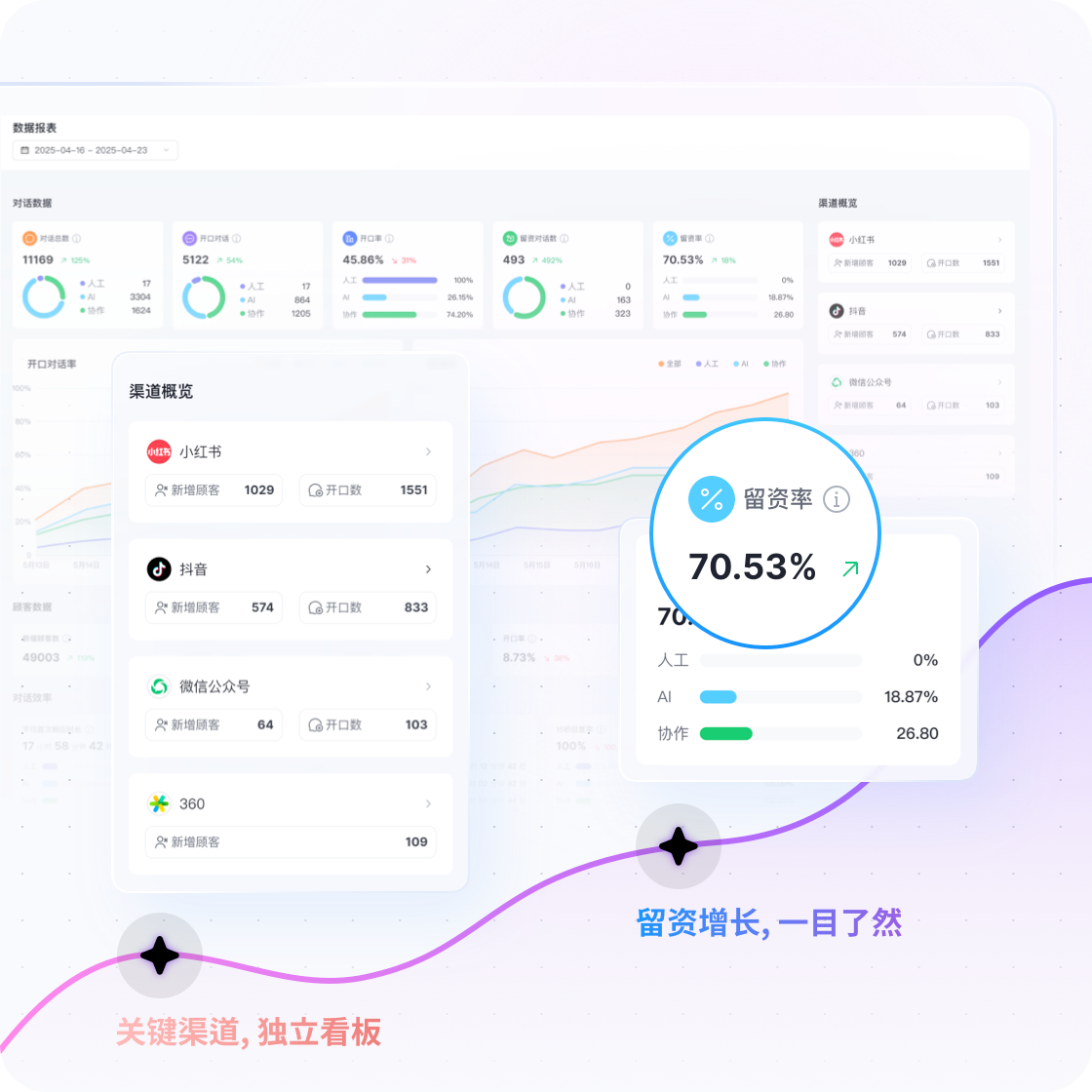 - 多维度数据看板实时更新: 提供包括会话量、转化率、客服效率、客户满意度等在内的多维度数据指标,支持管理层实时决策。