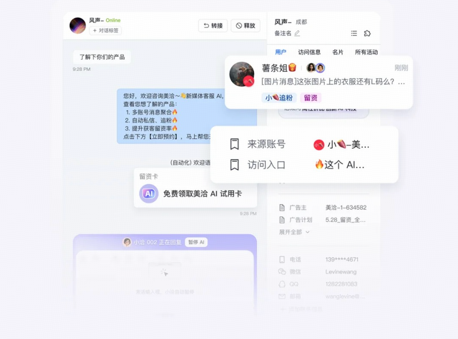 核心价值: AI 自动识别了 80%的重复性问题,并将客服人力资源释放出来,专注于 20%高意向、高客单价的复杂咨询。它实现了自动化初筛 + 智能转化的获客闭环。