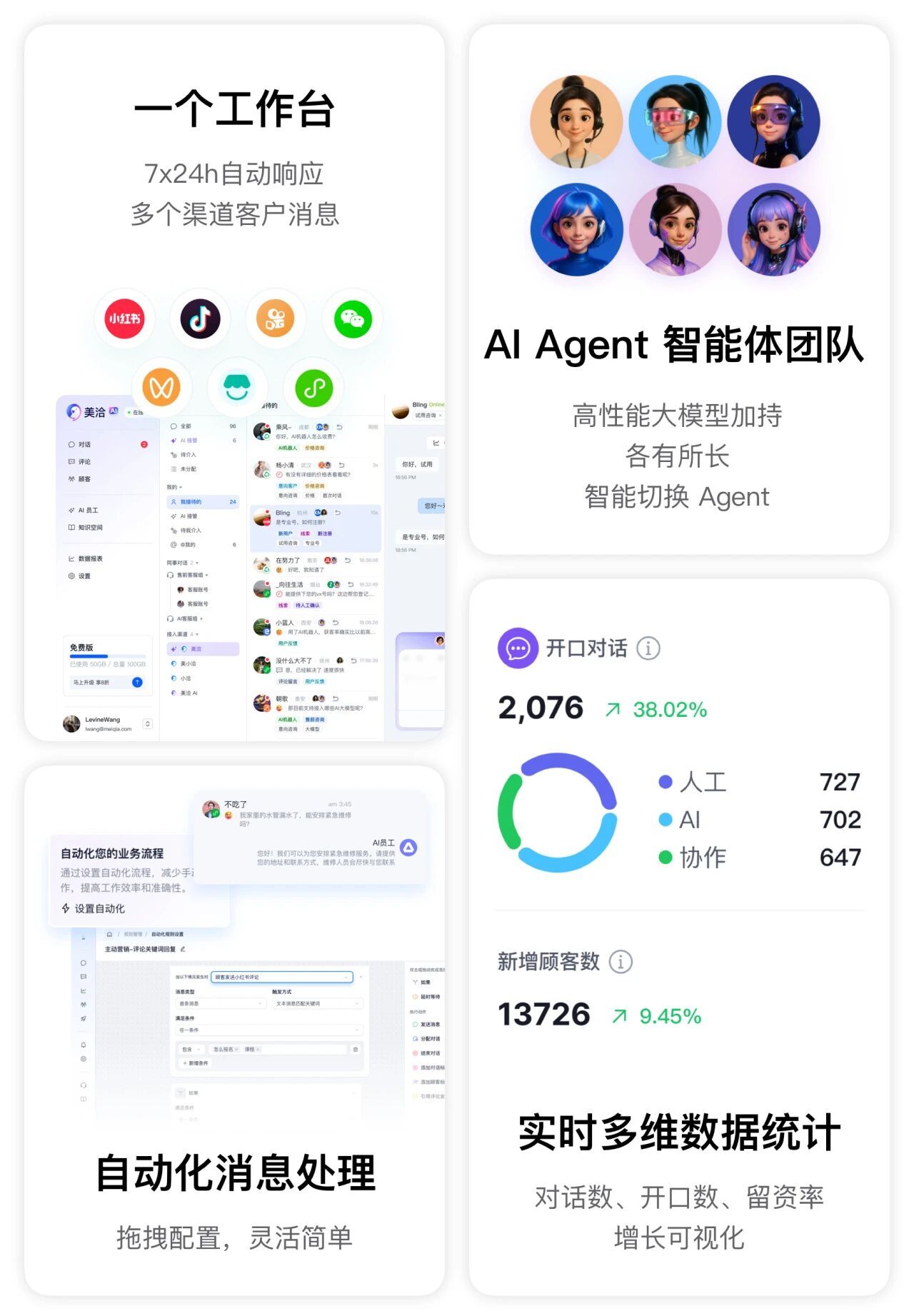 针对F司提升新媒体渠道获线效果的核心诉求,美洽AI推荐接入全新版本「小洽AI Agent」,主要从搭建更智能的AI智能体团队、更具「真人感」的回复配置、更精准的筛选客资、和实时数据监测四个维度,对其接入新媒体渠道的账号获客效果进行强势提升。