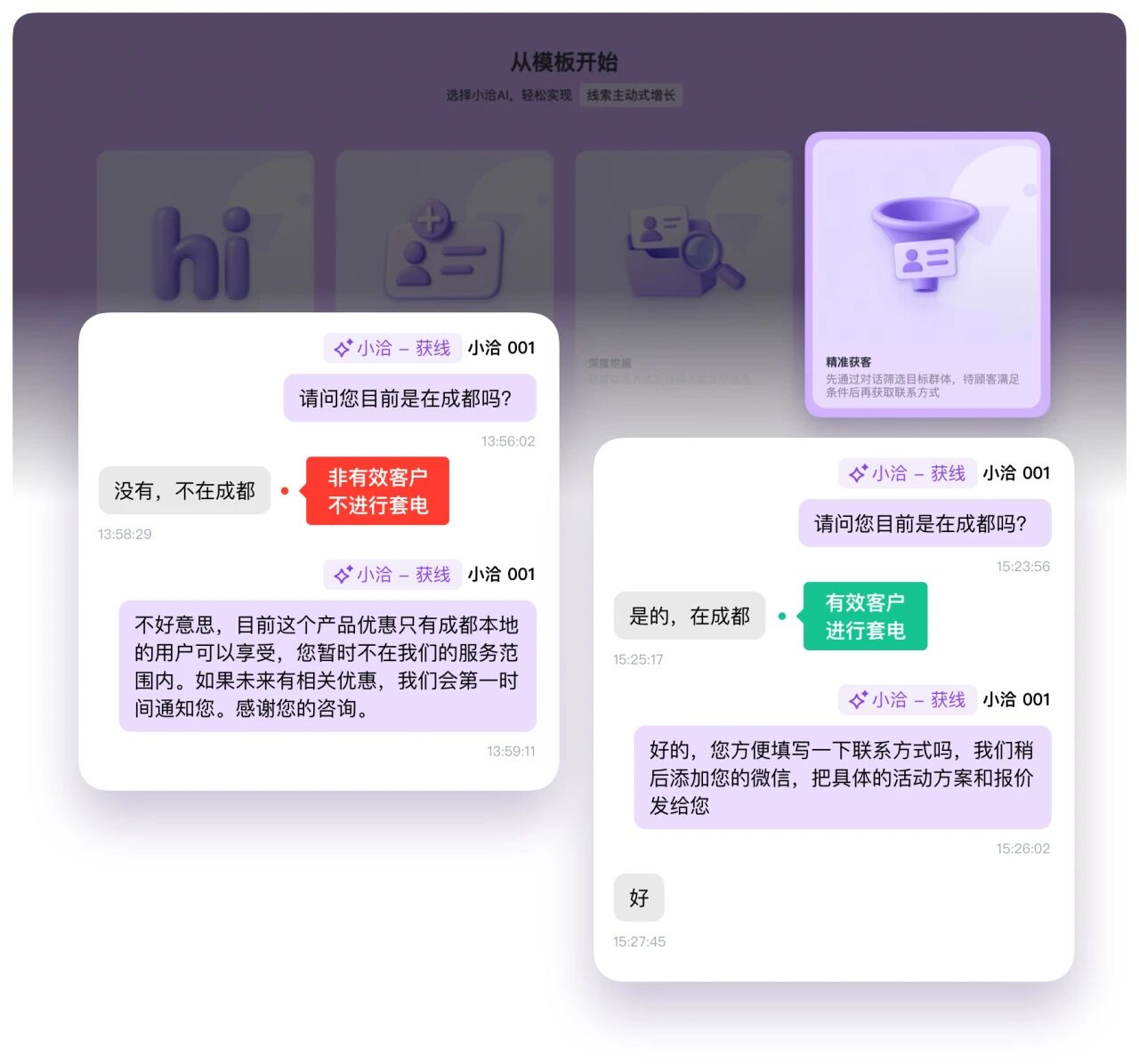 美洽AI根据现有客户反馈和行业调研,上线了智能筛选目标线索功能。配置该功能后,AI Agent能够通过对话,会在判断进线咨询用户是否符合服务条件后,再进行套电。智能筛选功能,能够高效提升客资的精准度,为后续销售转化降低了服务成本。