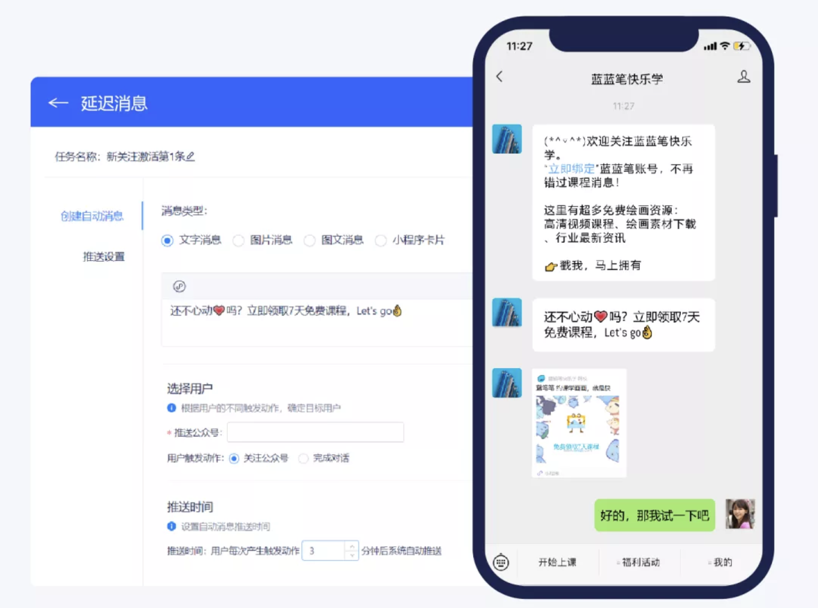 针对在 * 美洽完成对话 * 的粉丝,可以在 48 小时内推送多条营销消息,由系统自动发送不同类型的营销消息,促成转化成交。